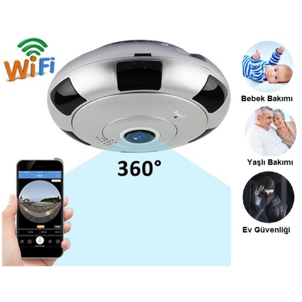 Kablosuz Panoramik Kamera 1080P Gece Görüşlü , 360/180˚ P2P, SD KARTA KAYIT, ALARM, WIFI